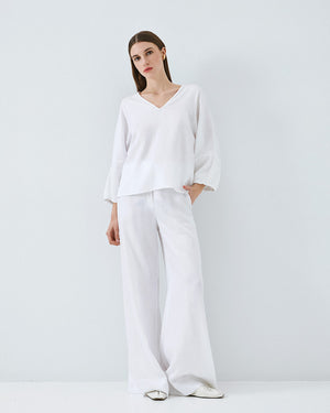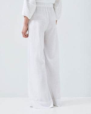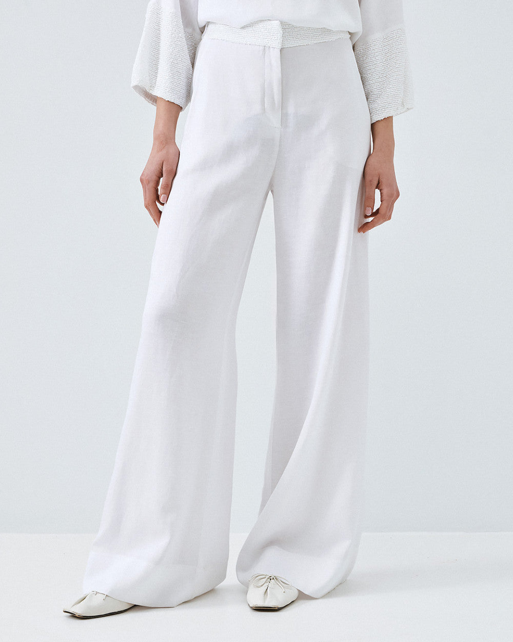 The trousers are designed with a high-rise waist and a wide-leg cut, creating graceful movement with every step. A decorative waistband detail subtly defines the waist, while the lightweight fabric ensures breathability and ease throughout the day.