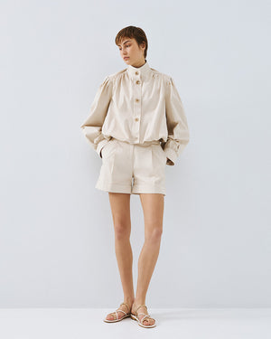 These tailored shorts offer a refined yet relaxed look, crafted from a comfortable cotton blend of 97% cotton and 3% elastane for a soft feel with subtle stretch. Designed with front pleats and neatly cuffed hems, they create a flattering, structured silhouette that remains easy to wear. The removable tie belt adds versatility, while belt loops allow for alternative styling. Finished with practical side pockets, decorative welt pockets at the back, and a secure front zip and button closure, these shorts pair perfectly with the matching jacket from the collection for a polished, coordinated outfit.