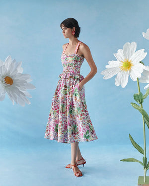 The exclusive floral print, developed from Celia’s original artwork, evokes blooming gardens under the tropical skies of Thailand. Designed with adjustable straps for a personalized fit, it also features a back zip closure and side pockets. The kind of dress you’ll choose for when you want to feel confident, feminine and ready for anything, from summer lunches to sunset celebrations.