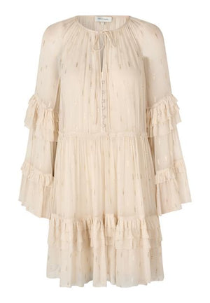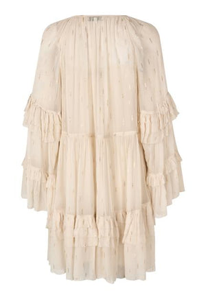 The Juliet Dress by Dea Kudibal is the epitome of effortless elegance. Crafted in a soft champagne-hued fabric, this ethereal dress features metallic thread detailing throughout, adding a subtle shimmer perfect for daytime sophistication or evening allure.