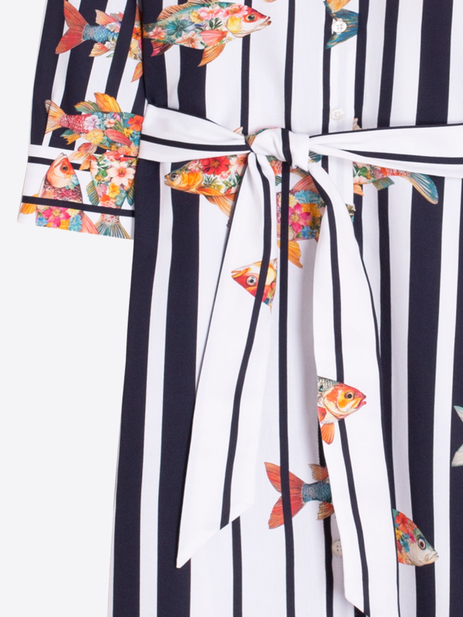 • This eye-catching Vilagallo shirt dress is crafted from 100% cotton, offering a light, breathable feel perfect for warm-weather wear. Designed with classic navy and white vertical stripes, it’s brought to life with playful colourful fish motifs, showcasing the brand’s signature mix of elegance and fun.