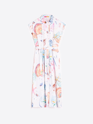 This beautifully feminine Vilagallo midi dress captures effortless seaside elegance with its delicate seashell and starfish print in soft, sun-washed tones. Designed to evoke relaxed coastal living, it’s a perfect blend of charm and sophistication.