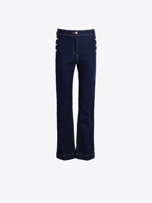 Cut with a subtle flared leg, the trousers create a balanced, elegant shape that works effortlessly from day to evening. Decorative side button detailing at the hips adds a distinctive, nautical-inspired touch, while contrast stitching enhances the structure and craftsmanship of the design.